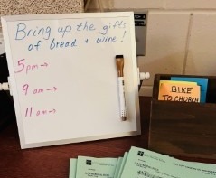 Please let us know! Simply sign up on this white board when you arrive at Mass, located on the table inside the sanctuary, to the right of the doors. You can also speak to the Mass Coordinator to let them know you are interested—that person is often standing near the baptismal font greeting people and holding cross necklaces, looking to recruit Eucharistic Ministers as they arrive.